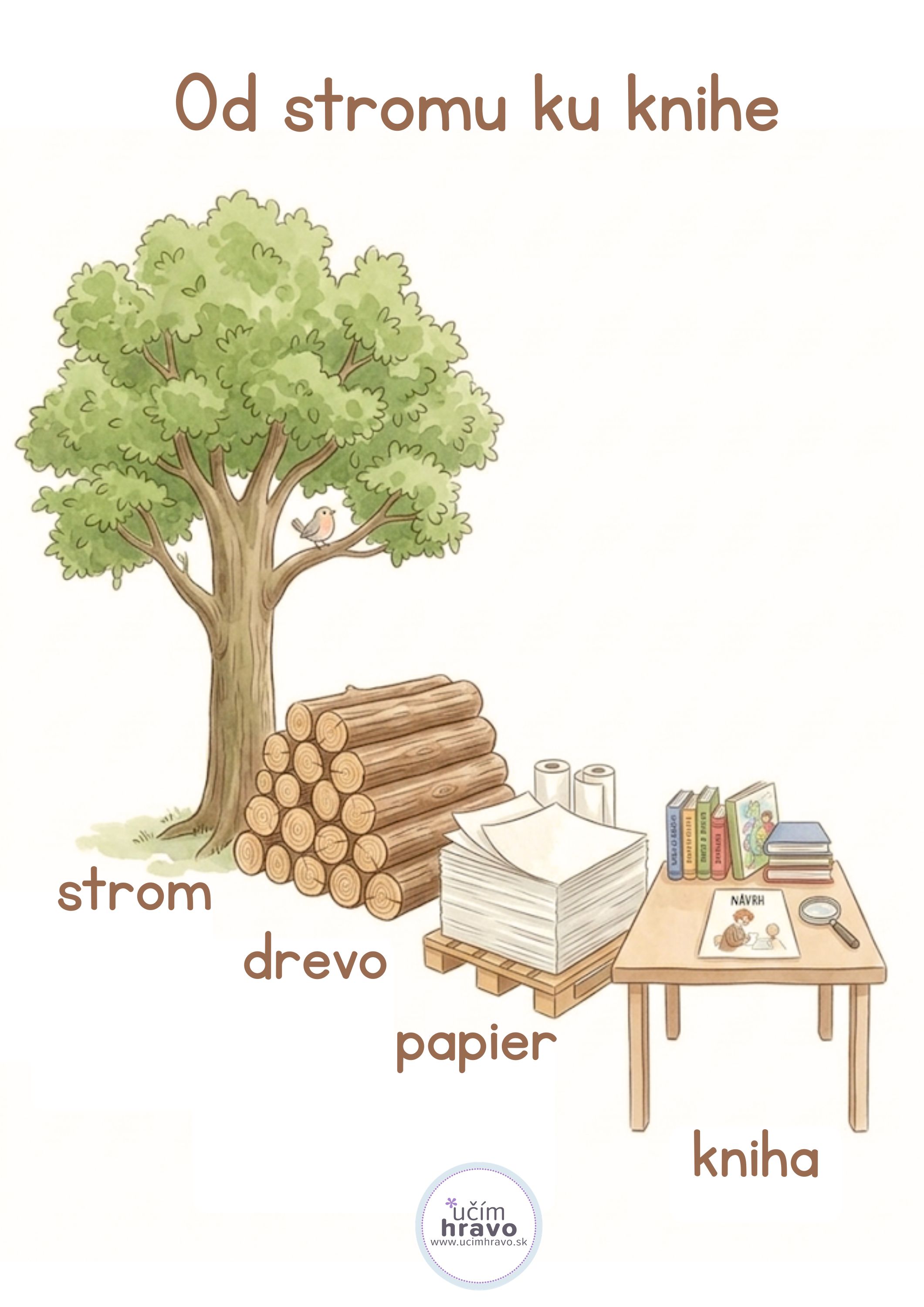 Obrázok znázorňujúci cestu knihy - deti zistia, že na úplnom začiatku je strom, z ktorého sa získa drevo, vyrobí papier